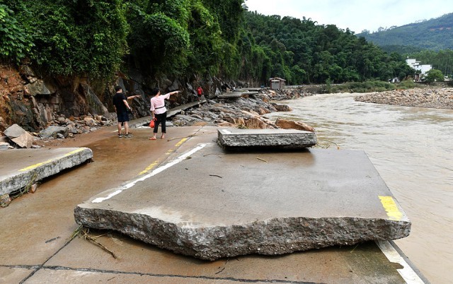 2023年9月5日,福州,受台风“海葵”影响,永泰县当天凌晨起全县强降雨,导致多处道路塌方和内涝。图为福州市永泰县塘前乡路面大面积坍塌。