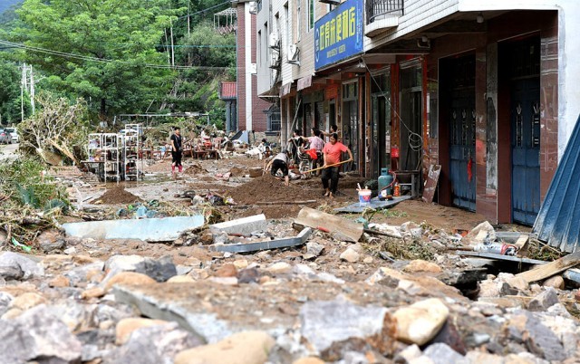 图为9月5日福州市永泰县塘前乡村民在清理淤泥。