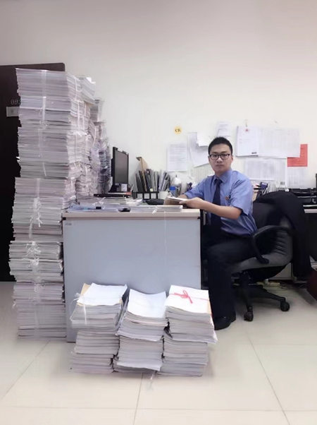 北京市朝阳区人民检察院第二检察部检察官石林山在办公桌前,周围是堆积如山的案卷材料。受访者供图