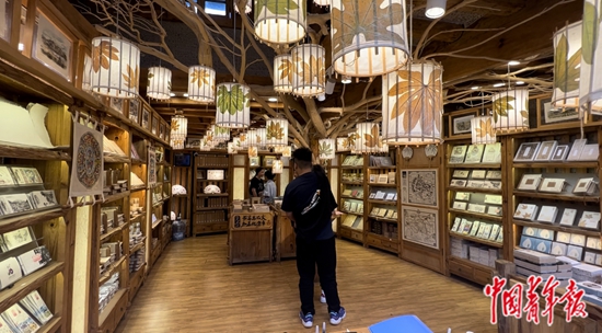 在云南丽江古城内的一家东巴纸坊里,操着一口东北话的张洋正在向南来北往的年轻游客推荐着纸灯和折扇等文创产品。他在这里已工作10余年。
