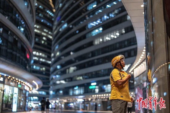 9月5日晚,北京市朝阳区,望京SOHO楼下,快递员常凯在等待接单的空隙,对着玻璃整理衣服。常凯是费家村“小哥加油站”的店长,除了送外卖,他现在把更多精力放在店里的建设上。从服务客户到服务小哥,常凯正经历人生中的一次转型。