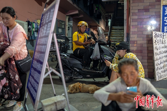初秋夜晚,费家村街头人来人往。“小哥加油站”亮着灯,常凯和高丰拿出准备好的水果、瓜子,陆陆续续有外卖骑手和快递员进屋。付丛荣给女儿打完电话,站在“加油站”心愿板前看了一会儿,彩色便笺纸上写着“想要个电冰箱”“找到对象早脱单”“中500万”等留言,他也犹豫着,要不要写一个心愿贴在上面……