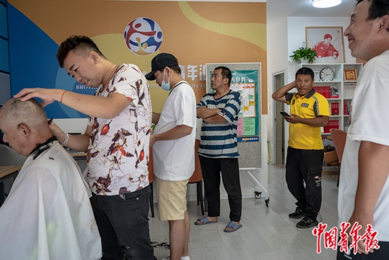 9月5日下午,北京市朝阳区费家村,付丛荣(右二)在“小哥加油站”排队等待理发。