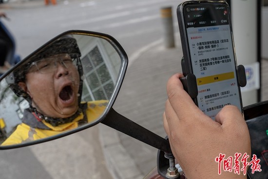 9月2日,北京,常凯在路边等红绿灯的时候一边刷单一边打着哈欠。为了给骑手提供“24小时服务”,他平时睡在“小哥加油站”里的一张简易折叠床上,有时候要忙到后半夜。