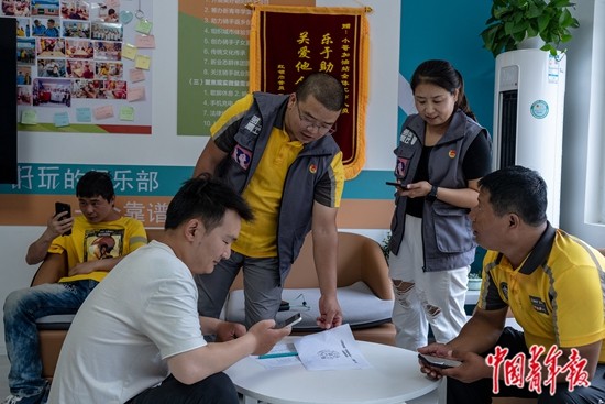 店里的活动区有一块白板,各类活动已经提前按照日期排好。骑手们可以在下班后来这里看电影,也可以在跑单之余享受免费的理发服务。来自五湖四海的骑手们通过每月一次的生日聚会彼此相识,有的年轻人在相亲活动中找到了爱情。“加油站”成立初期并不像现在这样热闹,常凯和另两位外卖骑手高丰、董婉秋一起,在村里挨家挨户敲门推广,因为过于热情,他们甚至曾被误认为是骗子。今年北京的夏天异常炎热,说起那段出门“地推”的经历,社工高丰很看得开,他觉得炎热的天气反而帮了忙,“店里有空调,还有提前冰好的西瓜,大家都爱来。”