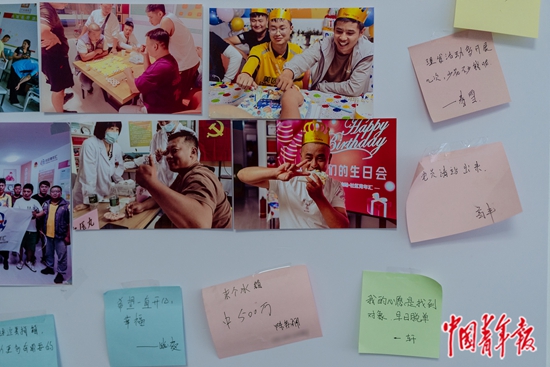 9月5日,北京市朝阳区费家村,“小哥加油站”的心愿墙上,贴着最近几个月的活动照片和大家的心愿。
