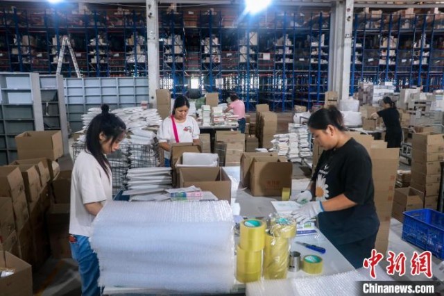 9月14日,中图网副总经理刘警慧查看新入库的图书。邢占山 摄