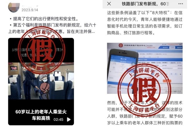 上海辟谣平台注意到,除了享受票价5折是假的,网传所谓的老年人“8大特权”也是拼凑编造而成,大部分是根据铁路方面推出的重点旅客服务内容进行的演绎,相关配图存在误导。