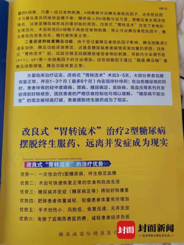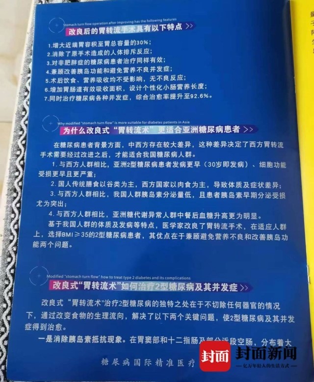泰和医院发放的宣传册称,这项手术2004年被引进中国,但亚洲部分人群手术后会出现腹泻及营养不良,覃某升医生作为创始人带领科研攻关组,改良创造出适合亚洲人体质的改良式“胃转流术”;患者须经过严格医学检测、符合条件才能进行手术,一次性治疗可实现停针停药,术后不复发,可吃水果和甜食。