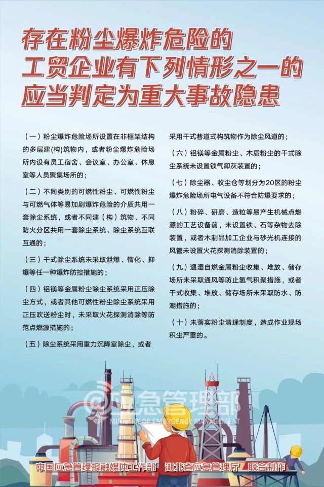 6.未按规范制定粉尘清理制度,作业现场和相关设备设施积尘未及时规范清扫;铝镁等金属粉尘的收集、贮存等处置环节未落实防水防潮、通风、氢气监测等必要的防爆措施。