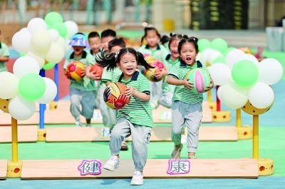 在山东省沂南县第二实验幼儿园,孩子们参加“趣味跨栏”游戏。新华社发