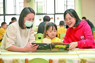 在福建幼儿师范高等专科学校附属第一幼儿园,幼儿园老师(右)、幼儿家长和孩子共同体验亲子阅读。新华社发