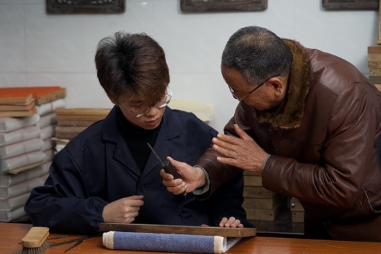 朱旭(左)向外公陈义时学习雕版印刷技艺。