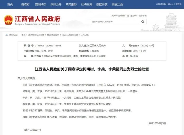 10月10日,江西省人民政府同意评定何明树、李兵、李荣强同志为烈士。