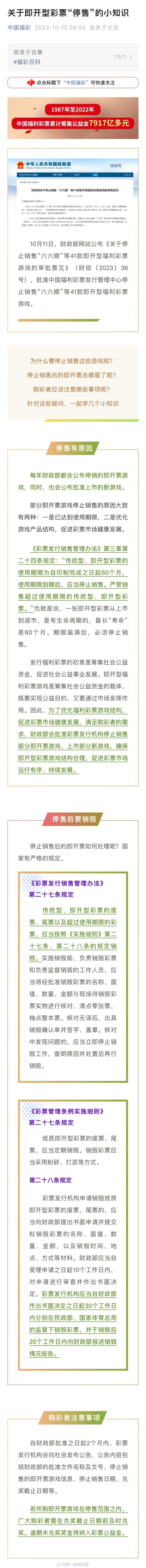 10月11日,财政部网站公布《关于停止销售“六六顺”等41款即开型福利彩票游戏的审批意见》,批准中国福利彩票发行管理中心停止销售“六六顺”等41款即开型福利彩票游戏。
