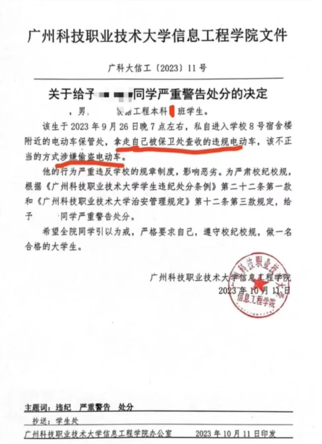 据了解,该事件发生在今年9月,当时该学院一名大学生在宿舍楼附近发现了自己的电动车,并将其骑走。然而,他并不知道,这辆电动车已经被学校保卫处查收,并放在了电动车保管处。保卫处在查看监控录像后发现了该学生的行为,并将其叫到保卫处进行调查。