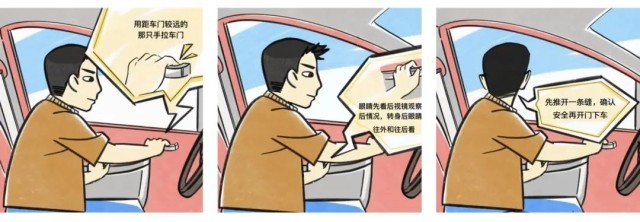 开的时候先开一寸,通过这个缝隙观察后方和侧方的情况,同时这个缝隙也警示周围的车辆和人员,而后呢开半尺,最后是全打开。另外呢,驾驶人除了自己在开门的时候要做到规范、要保证安全,还要对乘车人进行提示。