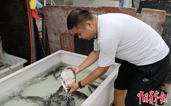 董云龙正在向顾客展示“三花五罗”之一的鳊花鱼。中青报·中青网见习记者 贾骥业/摄