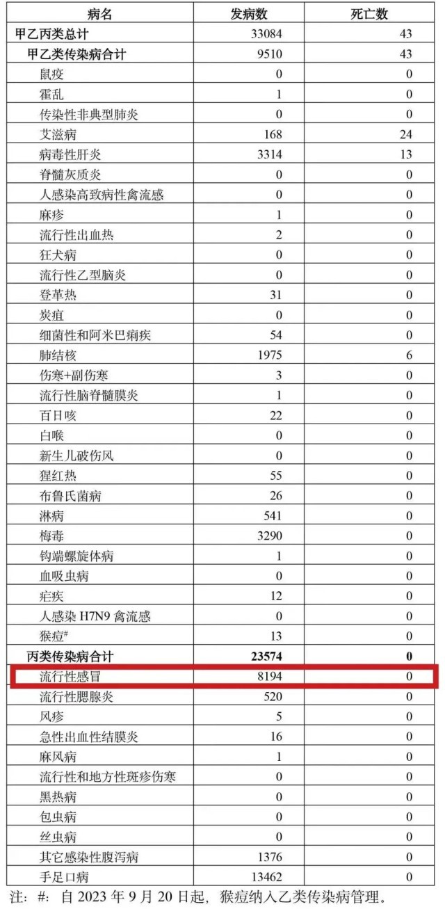 江苏卫健委通报称,2023年9月1日0时至9月30日24时,除新型冠状病毒感染外,江苏全省共报告甲、乙类法定报告传染病发病9510例,死亡43人;本月除鼠疫、传染性非典型肺炎、脊髓灰质炎、人感染高致病性禽流感、狂犬病、流行性乙型脑炎、炭疽、白喉、新生儿破伤风、血吸虫病、人感染H7N9禽流感无发病报告外,其余19种甲、乙类传染病均有病例报告。