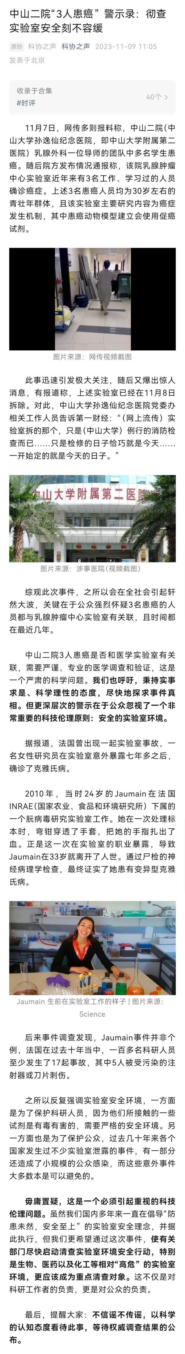 中国科学技术协会微信公众号“科协之声”,11月9日发文称,11月7日,网传多则报料称,中山二院乳腺外科一位导师的团队中多名学生患癌。随后院方发布情况通报称,该院乳腺肿瘤中心实验室近年来有3名工作、学习过的人员确诊癌症。上述3名患癌人员均为30岁左右的青壮年群体,且该实验室主要研究内容为癌症发生机制,其中患癌动物模型建立会使用促癌试剂。