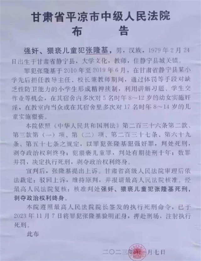 极目新闻11月11日消息,据华商报大风新闻、红星新闻等多家媒体报道,近日,一份“甘肃省平凉市中级人民法院”的布告引发网络关注,内文称该市静宁县某小学校长张隆基强奸、当众猥亵多名学生,于11月7日被执行死刑。11月11日,静宁县政府办工作人员向极目新闻记者证实,该公告系平凉市中级人民法院所发。据当地有关部门透露,案发后已对被害学生开展帮扶、救助,该小学系村小,目前已撤并。