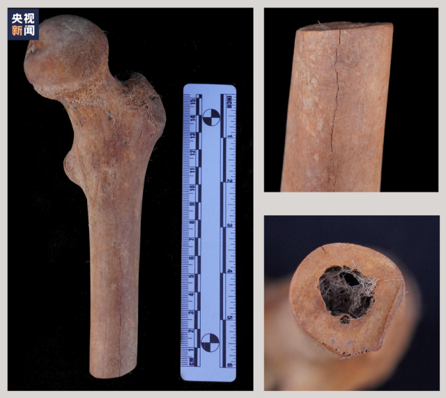 一具烈士骸骨右腿股骨处有切痕,文少卿介绍,从截面可以看出,有一部分不平整,推测是在当时简陋的环境下接受了截肢手术。