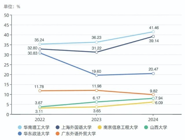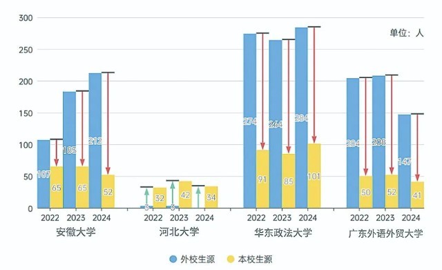 以2024年为例,在被调查的高校中,本校生源占比超90%的高校有河北大学 (94.44%)、山西大学(93.65%);占比在60%~75%区间的高校有南京信息工程大学(70.19%)、海南大学(67.15%);占比在30%~55%区间的高校有华南理工大学(44.60%)、北京大学(39.40%)、上海财经大学(38.02%)和外交学院(50.86%)。