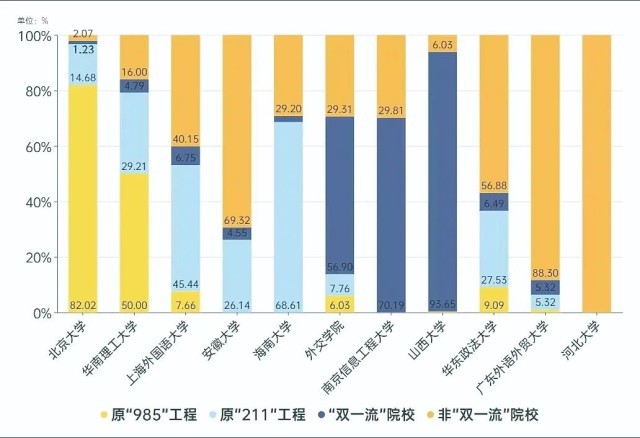 安徽大学作为一所“双一流”高校,其近3年来共接收来自非“双一流”院校的推免生比例接近七成,来自外校的“双一流”院校生源则少之又少。