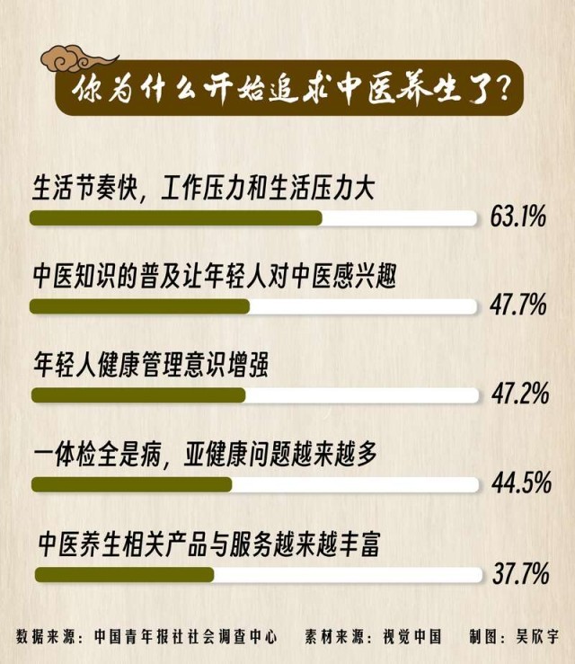 年轻人为什么开始追求中医了?数据显示,63.1%的受访青年觉得是因为生活节奏快,工作压力和生活压力大,47.7%的受访青年表示中医知识的普及让年轻人对中医越来越感兴趣了,47.2%的受访青年认为这代表着年轻人健康管理意识的增强,还有44.5%的受访青年表示一体检全是病,亚健康问题越来越多。除此之外,中医养生相关产品与服务越来越丰富(37.7%)、对中华传统中医药文化认同度变高(25.5%)等也是受访青年认为年轻人追求中医养生的重要原因。