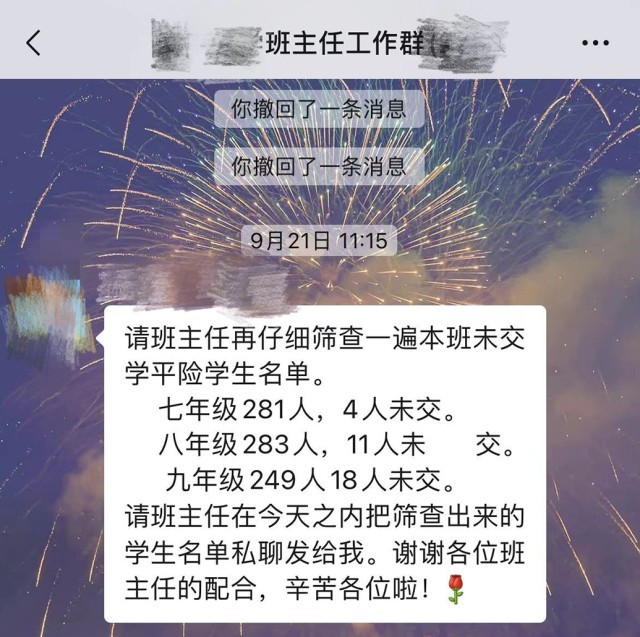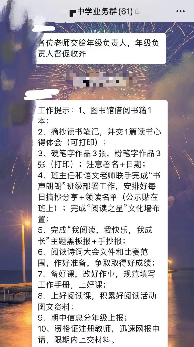 她要反复叮嘱学生,同时在家长群一一验收,“力求100%完成”。因为这些任务大多与她的绩效挂钩。但并非所有家长都愿意配合,因为需要确认的通知太多,她还为此被家长告到教育局。