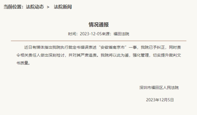 据深圳市福田区人民法院官网消息,近日有媒体指出法院执行裁定书错误表述“安徽省南京市”一事,法院已予纠正,同时责令相关责任人做出深刻检讨,并对其严肃追责。法院将以此为鉴,强化管理,切实提升裁判文书质量。