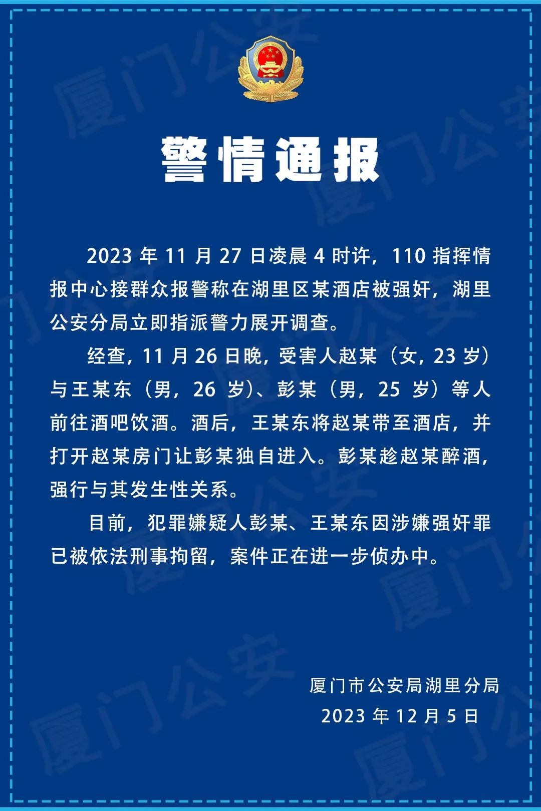 央广网厦门12月5日消息(记者 吴馨骅 邬眉 程若兰)近日,网传福建厦门外国语学校翔安附属学校两名教师涉嫌强奸的消息引发广泛关注。5日晚间,厦门市公安局湖里分局发布警情通报称,犯罪嫌疑人王某东(男,26岁)、彭某(男,25岁)因涉嫌强奸罪已被依法刑事拘留,案件正在进一步侦办中。