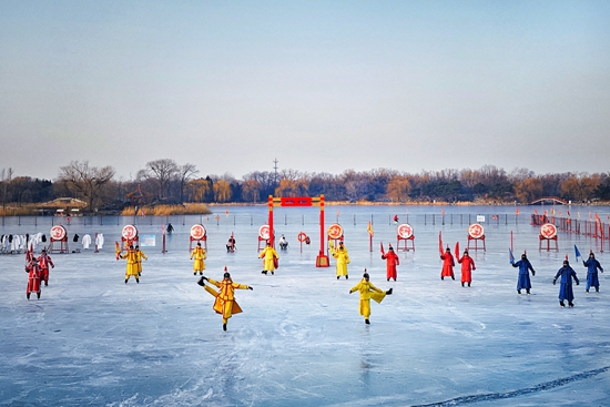 2023年1月23日,北京,圆明园遗址公园,专业的滑冰表演者在圆明园福海冰场上演绎皇家“冰嬉”,带游客穿越古今,感受清朝皇家冰上活动的盛大景象。视觉中国供图