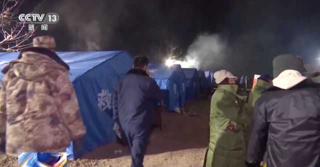 搭帐篷,分物资,尽管已是深夜,仍然有人来回奔走,奔波在救援一线。