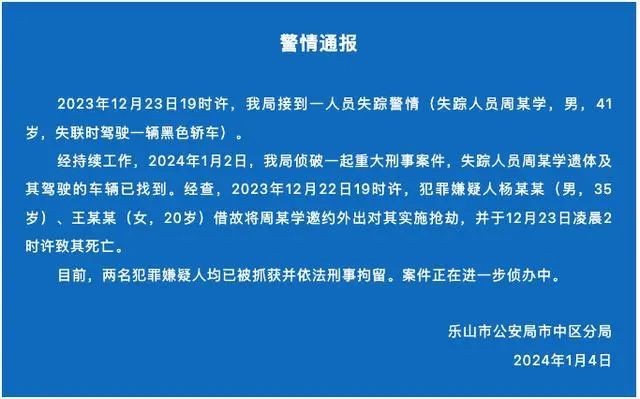 经持续工作,2024年1月2日,乐山市公安局市中区分局侦破一起重大刑事案件,失踪人员周某学遗体及其驾驶的车辆已找到。经查,2023年12月22日19时许,犯罪嫌疑人杨某某(男,35岁)、王某某(女,20岁)借故将周某学邀约外出对其实施抢劫,并于12月23日凌晨2时许致其死亡。