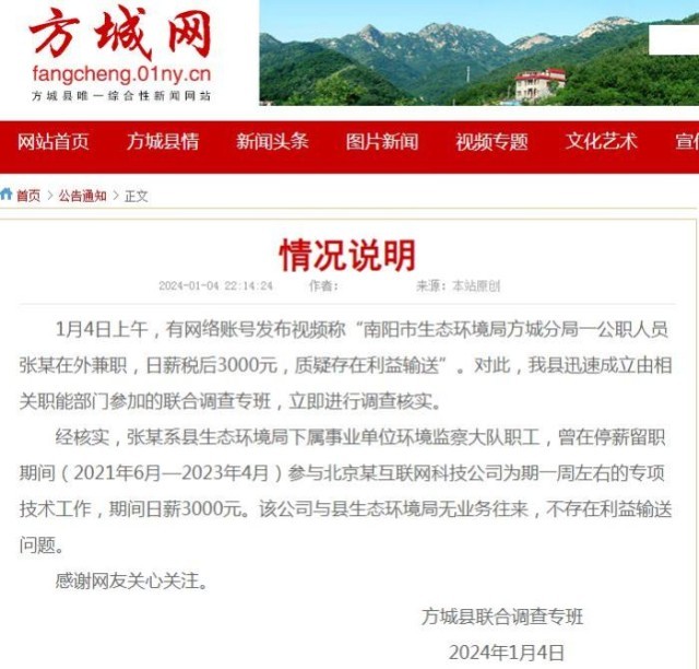 经方城县联合调查专班核实,张某系县生态环境局下属事业单位环境监察大队职工,曾在停薪留职期间(2021年6月—2023年4月)参与北京某互联网科技公司为期一周左右的专项技术工作,期间日薪3000元。该公司与方城县生态环境局无业务往来,不存在利益输送问题。