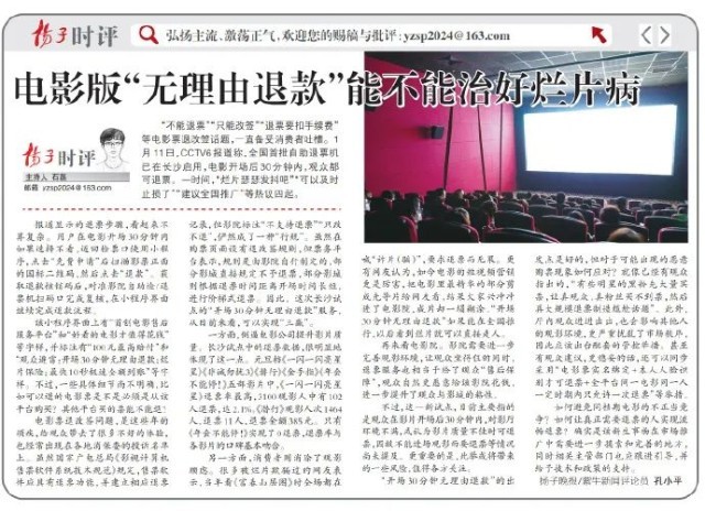 “开场30分钟无理由退款”的出发点是好的,但对于可能出现的恶意购票现象如何应对?就像已经有观众指出的,“有些明星的黑粉先大量买票,让真观众、真粉丝买不到票,然后再大规模退票制造尴尬话题”。此外,厅内观众进进出出,也会影响其他人的观影环境,更严重扰乱了市场秩序,因此应该出台配套的管控举措。甚至有观众建议,更稳妥的话,还可以同步采用“电影票实名绑定+本人人脸识别才可退票+全平台同一电影同一人一定时期内只允许一次退票”等举措。