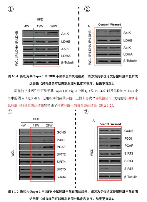 以发表在肝肠疾病领域的一篇论文为例,他们将该论文与主要作者的学位论文对比,发现多处数据被“移鼠接猪”,同样的实验图片,在不同的论文中被标注为“小鼠肝脏中的蛋白表达结果”和“仔猪肝脏中的蛋白表达结果”,“仅通过裁剪的手段,就把鼠的结果转移到了猪上”。