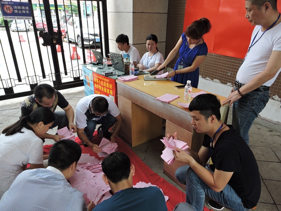 城市春天小区第三次业主大会召开时,业主代表在消防通道进行开箱验票统计。受访者供图