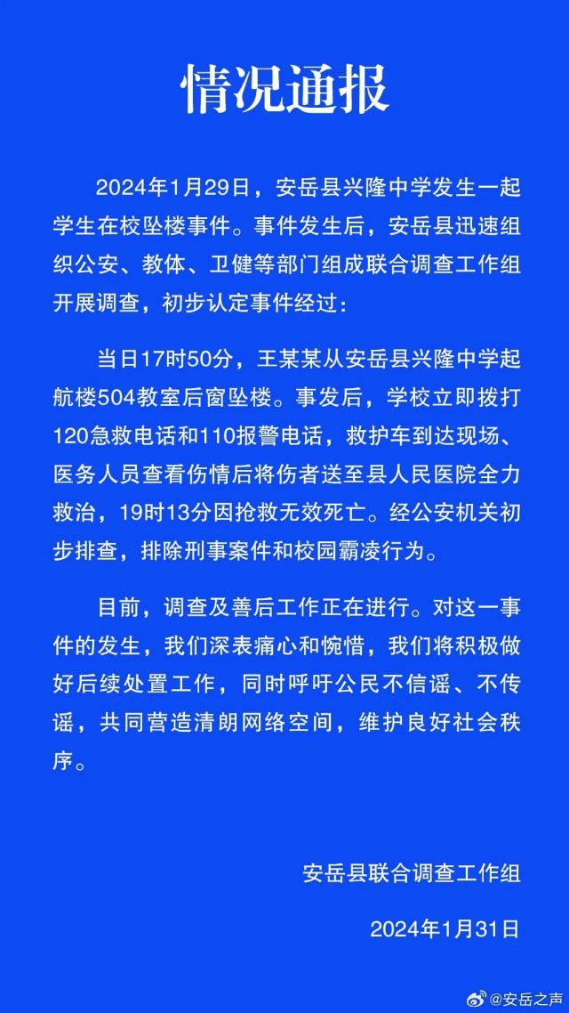 1月31日,四川省资阳市安岳县官方微博@安岳之声就该县一中学学生坠楼事件发布情况通报。通报称,初步认定事件经过:1月29日17时50分,王某某从安岳县兴隆中学起航楼504教室后窗坠楼。
