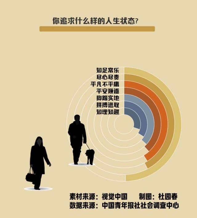 日前,中国青年报社社会调查中心联合问卷网(wenjuan.com),对1500名青年进行的一项调查显示,知足常乐(49.6%)、尽心尽责(42.3%)、平凡不平庸(41.1%)是受访青年心中最为理想的三种人生状态。
