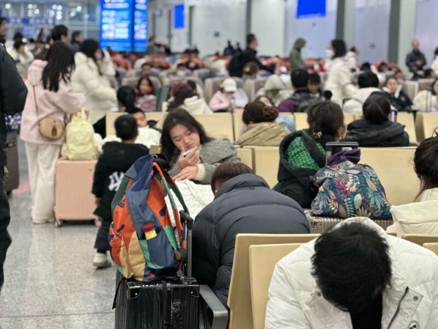 2月5日,湖南。铁路怀化南站候车室里,旅客咨询列车晚点情况。中青报·中青网见习记者刘胤衡/摄