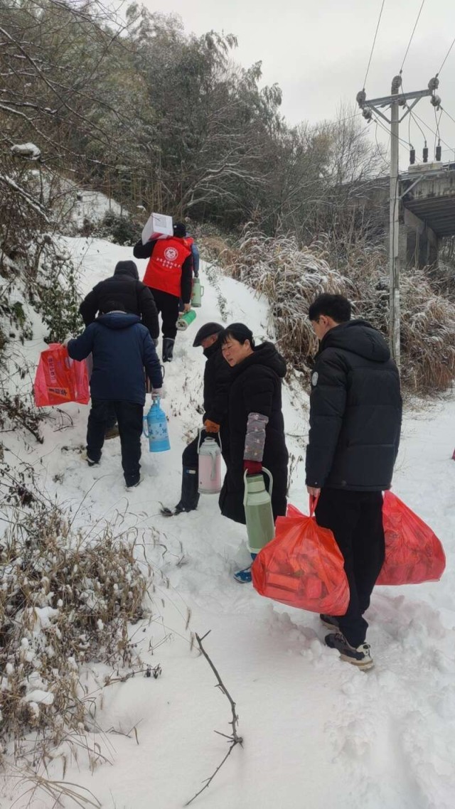 4日早晨7点多,付小琼就和村两委开会商议送物资方案,他们决定带领新时代文明实践站的志愿者抄小路翻过两百米高的山坡运送物资。她介绍,响山寺村坐落在山脚下,高速路经山顶,如果开车去高速路边,不仅路滑,而且绕了远路,直接上山抄近道最方便。