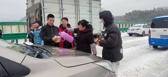 付小琼来回跑了四趟,一直忙到4日下午2点多。她记得,有一位来自湖北的司机,带着老婆孩子一起跑车,一家人已经15个小时没有进食 ,她赶忙递上一个热水瓶和两桶方便面。40多岁的司机流下眼泪,拿出手机,要为付小琼拍摄一段视频,想发在网上表达感激之情。付小琼摆摆手走开了,她说,“在我们老区,这都是很正常的”。