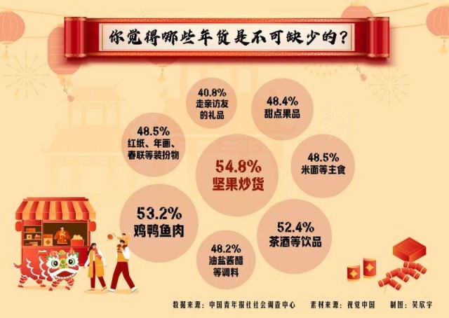 上周,中国青年报社社会调查中心联合问卷网(wenjuan.com),对1333名青年进行的一项调查显示,今年过年,超九成受访青年家中会置办年货,39.7%的受访青年会参与置办年货,坚果炒货、鸡鸭鱼肉、茶酒等饮品是受访青年常准备的年货。