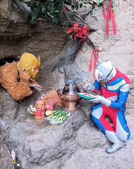 在河北邯郸涉县的一个天然溶洞里,演员套上猴子的服装和面具,把头露出洞外——从全国各地来的游客在洞口摆上水果、零食、啤酒,甚至零钱。最近,湖南卫视邀请景区一位猴子扮演者在某节目上与流行歌星合唱,最终因“形象不合”作罢。