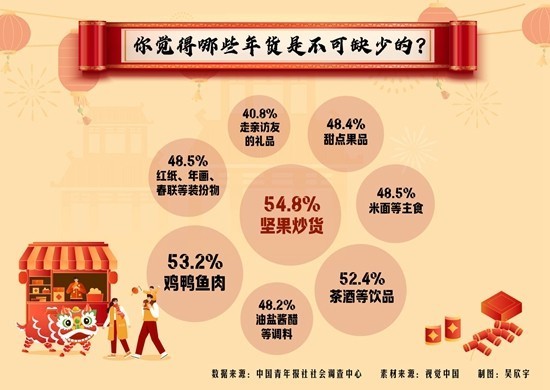 上周,中国青年报社社会调查中心联合问卷网(wenjuan.com),对1333名青年进行的一项调查显示,今年过年,超九成受访青年家中会置办年货,39.7%的受访青年会参与置办年货,坚果炒货、鸡鸭鱼肉、茶酒等饮品是受访青年常准备的年货。