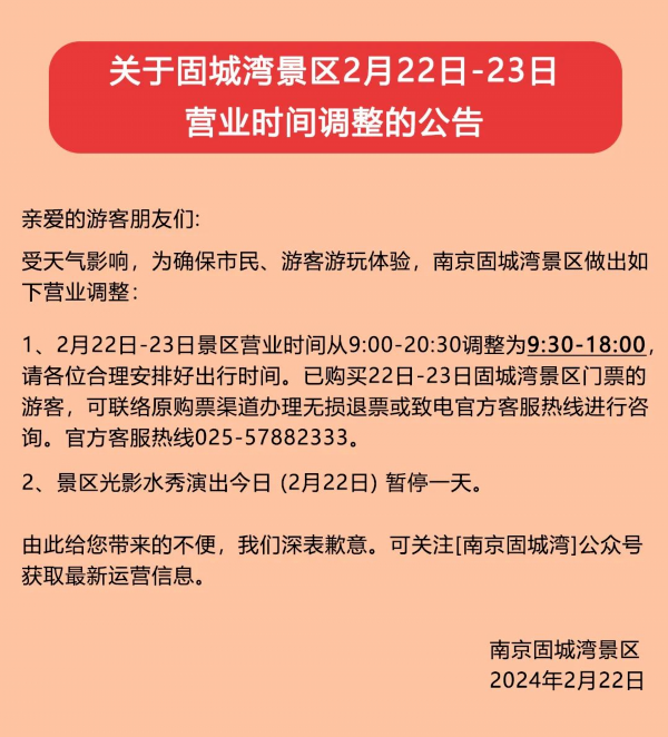 因天气原因,南京金牛湖景区将于2月23日-2月24日(周五-周六)临时闭园,请广大游客合理安排出行时间,如因此给您带来不便,敬请谅解。