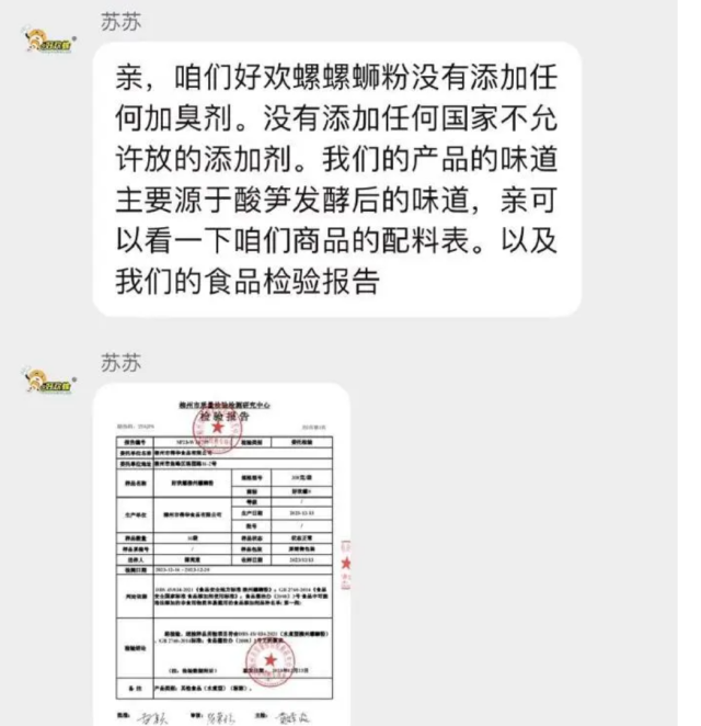 李子柒旗舰店客服回应称,有检测报告,产品质量都有保障。螺霸王食品旗舰店客服回应称:没有增臭剂,含少量添加剂,但都是符合要求的 。