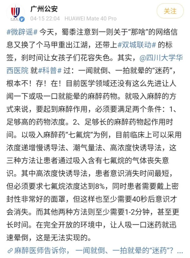 新闻多看点——早在2021年,一篇引用网帖炮制的《迷药盯上了广深女孩》文章,在网络疯狂传播,引发众多网友担忧。对此,广州、深圳警方紧急回应,陆续对“下迷魂药”进行辟谣。2021年4月15日,广州公安官方微博发文辟谣称,就吸入麻醉的方式来说,要起到麻醉作用,必须要满足两个条件:足够高的药物浓度,足够长的麻醉药物起作用时间。